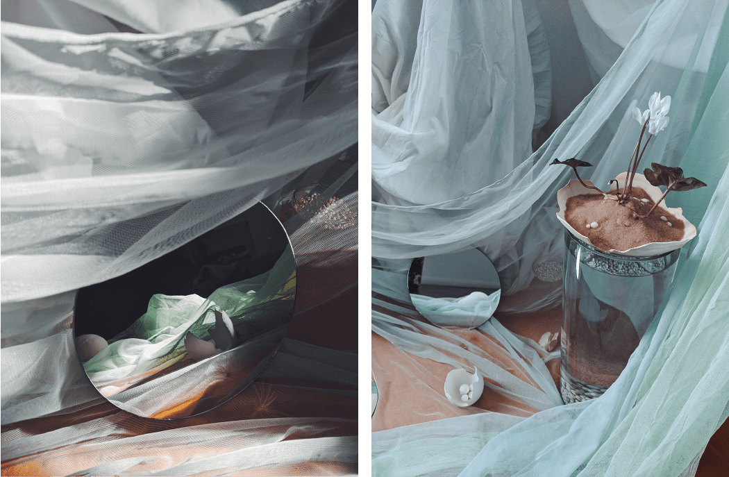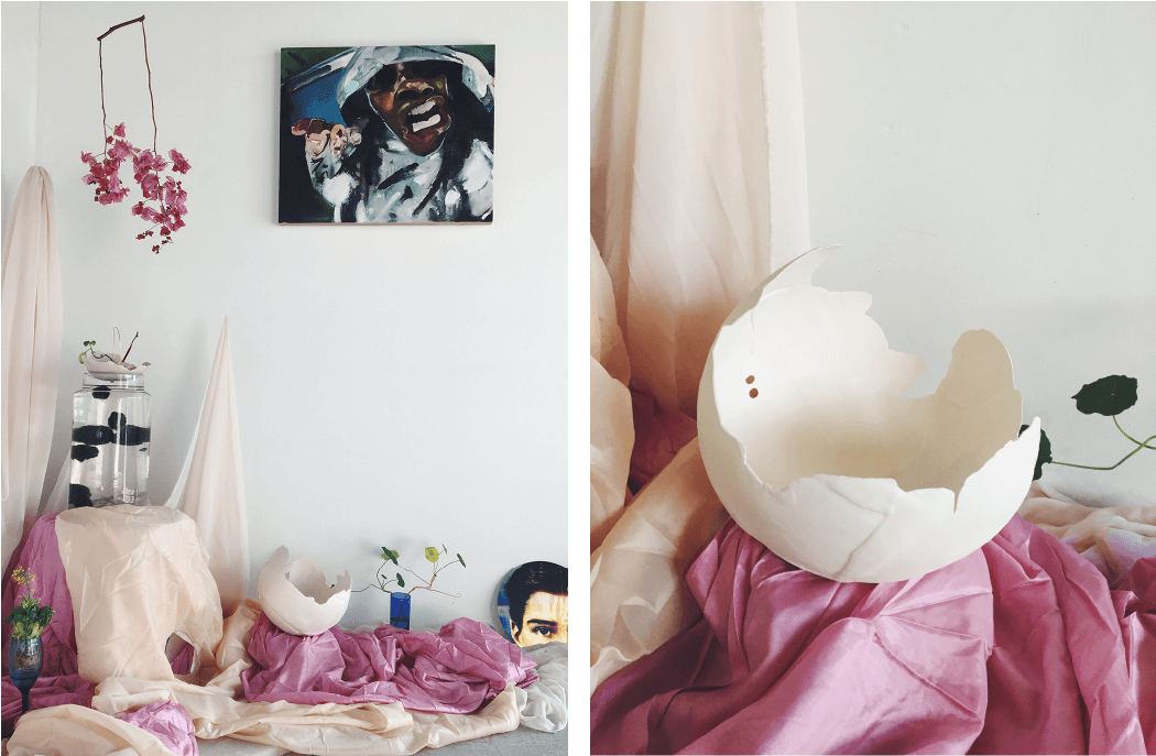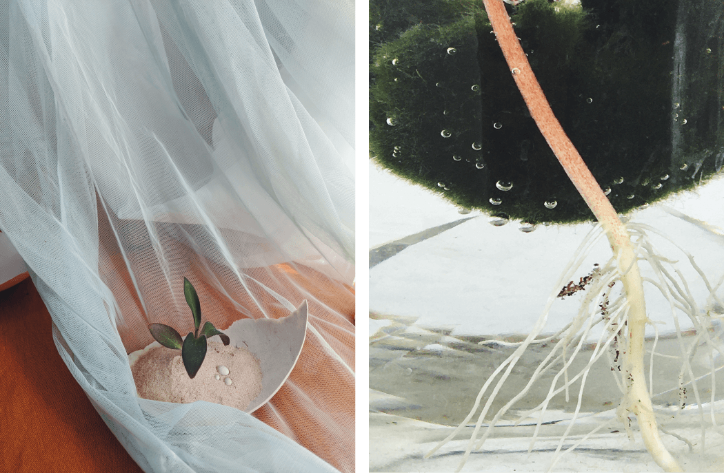 “These pieces are about the empowerment of the divine feminine,” she continues, “and the natural abundance of the earth rising to counter and reimagine the collapsing structures built in the age of separation, dominated by the ideals of toxic masculinity. [We are] planting seeds for the future amidst the rubble of the old. The work invites stillness, and the pleasure of slowness, to counteract the capitalist imperative to be in constant motion, in production. How do we slow down? How do we cultivate new, collectively-owned, systems of care? Systems that meet our basic needs and beyond, equally accessible to all, in which all beings are considered to be of equal value. What does a well-rested world look like? What would it feel like to prioritize wellbeing over productivity?"