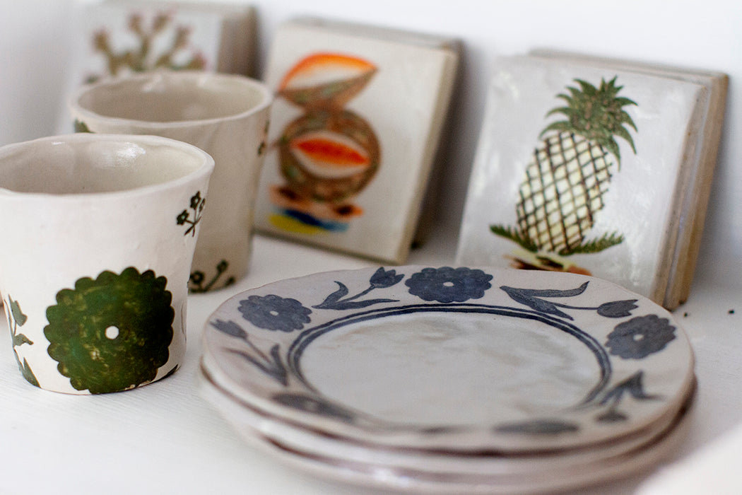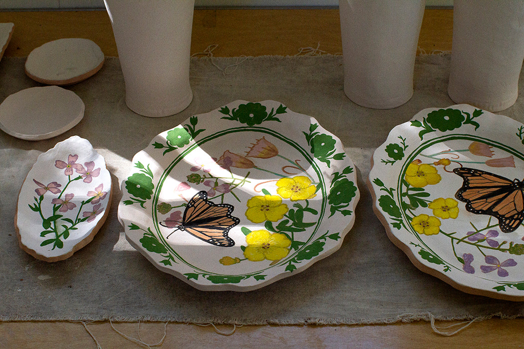 Around that time, Miles was drawn to ceramics. “I had a similar feeling with the book covers, in that I was making these functional paintings—objects that were in between sculptures and paintings,” she adds. The work itself is sometimes playful, depicting a frog leaping head first into a puddle. Other pieces are nostalgic, like a relic one might find at an ancient dig in Greece or Egypt. To further that sense of nostalgia, each plate, platter, vase, or serving bowl is hand-made, sometimes referencing pieces from her grandmother’s collection. “Contemporary heirlooms” is how Miles describes them, with each shape and painting unique in not only telling her story but also carrying on her family’s tradition.