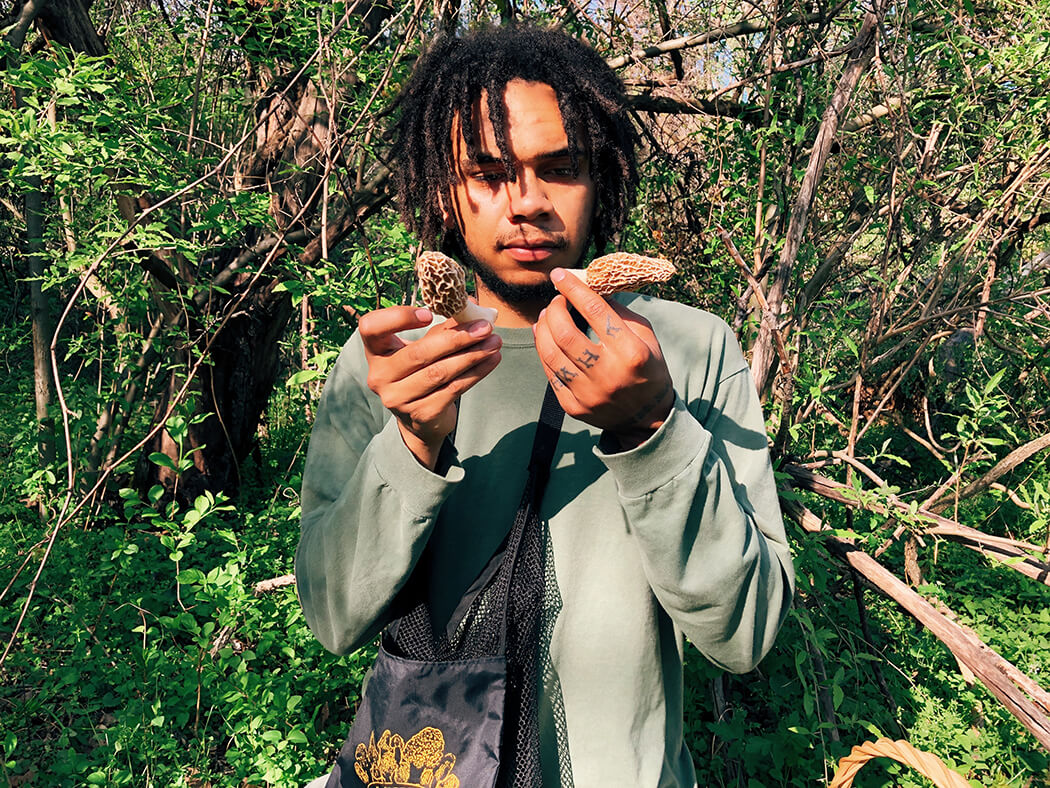 Since 2015, the 25-year-old Pennsylvania–, North Carolina–, and Colorado–based self-taught mycologist has infused rap with old-soul wisdom, and the permaculture and mushroom worlds with a transformative, unserious attitude aimed at educating a wide-ranging group of newcomers about the multiple benefits of fungi, in person and virtually. You can find him on Instagram beaming in sun-dappled woods as he holds up a just-foraged batch of giant porcini varieties (caption: “I love BIG BOLETES and I can not lie about this”) or taking his young son Leo out hunting for chanterelles and later crowd-sourcing his followers for new recipes; podcasting on his company’s home page; on Facebook at mycosymbiotics; and giving his own video tutorials on setting up a DIY mushroom lab on his Apex Grower YouTube channel.
