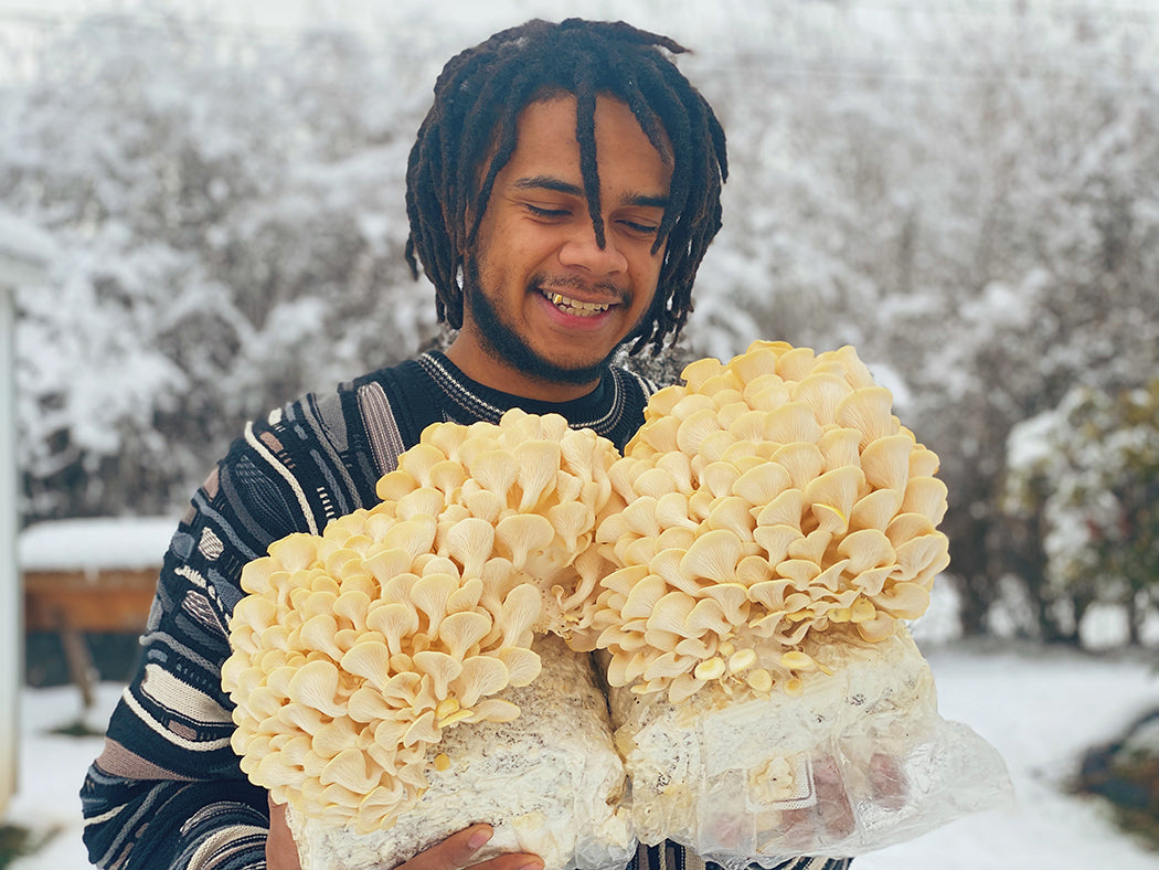 Between shifts as a restaurant server, Padilla-Brown first taught himself the way he now teaches so many others, watching online tutorials to learn how to cultivate mushrooms (“I tell people I’m a graduate of YouTube University,” he likes to say). He sourced equipment from university auctions and made a DIY humidifier using a pond fogger, buckets, and fans—the roots of what would become MycoSymbiotics.